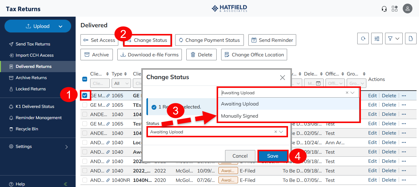 If the taxpayer selected to manually sign their return, but they actually want to e-sign, you can change the status of the return back to awaiting e-sign without recalling.