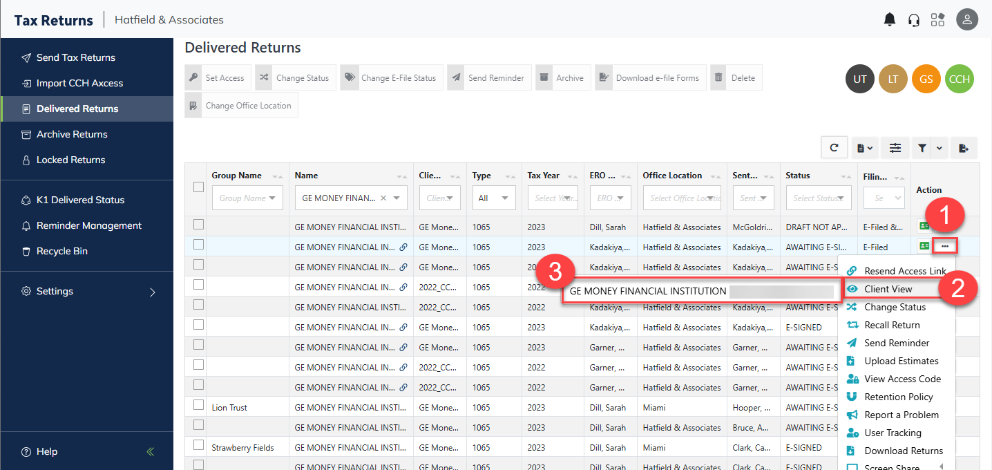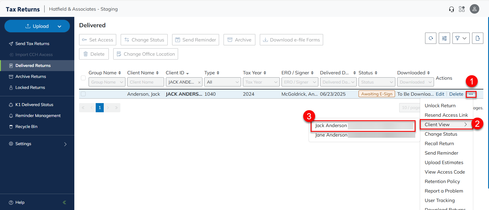 This option allows you to see the Client Portal as the client sees it. It is an up-to-date representation of what is available in the Client Portal. This is available for any delivered item that includes the Client View option. This option will be accessible only if the client has registered for the portal. No taxpayer actions can be taken from the Client View of the Client Portal except distributing K-1s if your firm settings allow.