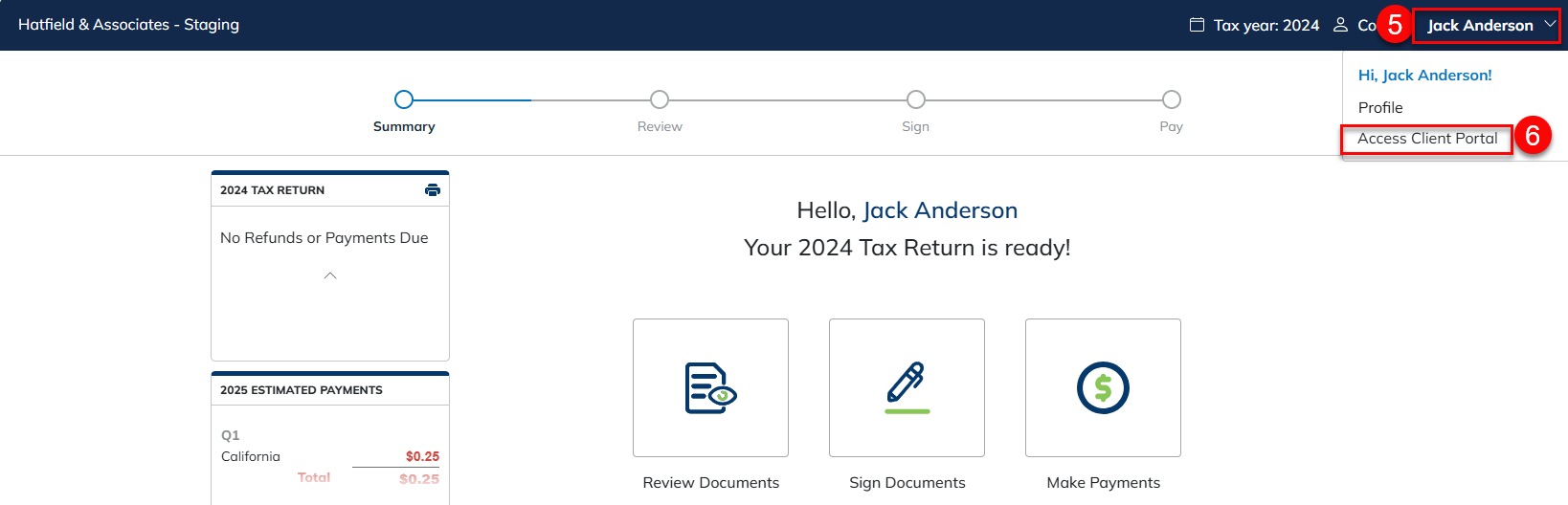 - Tax Payment Page: Clients can view and pay estimated and actual tax payment vouchers for all returns and extensions in a centralized location.