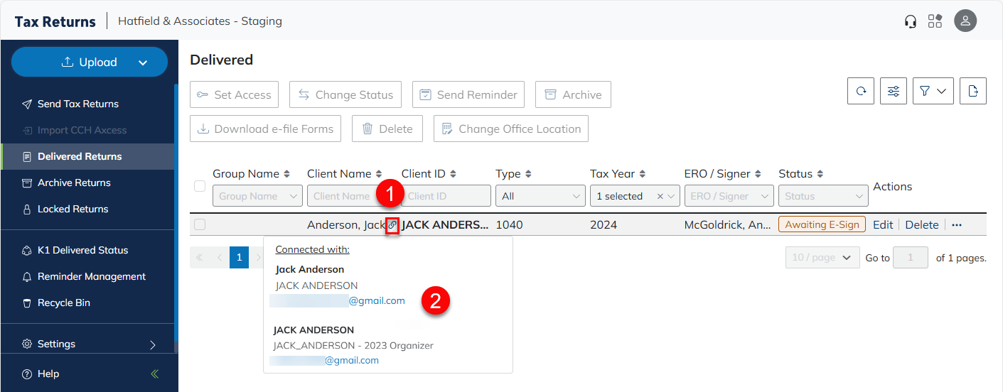 See a list of Names, Client IDs, and Email Addresses associated with this client in the Client Portal. This option is available across all SafeSend products except Exchange. The link icon will not appear unless the client has signed up for the portal.