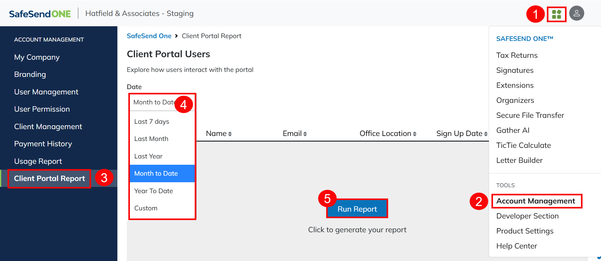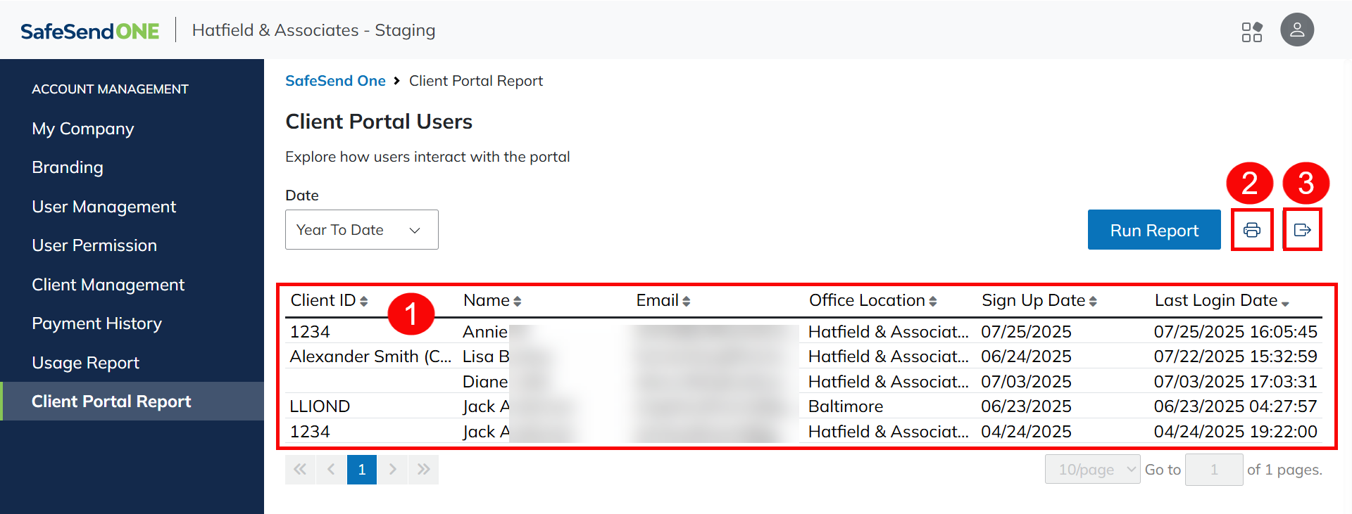The Client Portal Report allows you to view the firm's active Client Portal users. Administrators can view active client details, sign up date, and last login date.