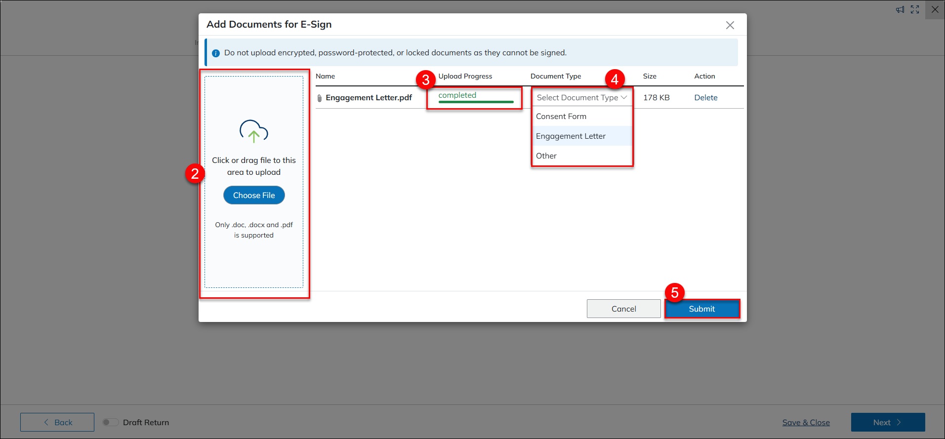 The Additional E-Sign Documents section is used to manually add e-file forms that were not included in the original return PDF. This section functions the same way as the E-File section after documents are uploaded. There is an upload limit of 30 documents.