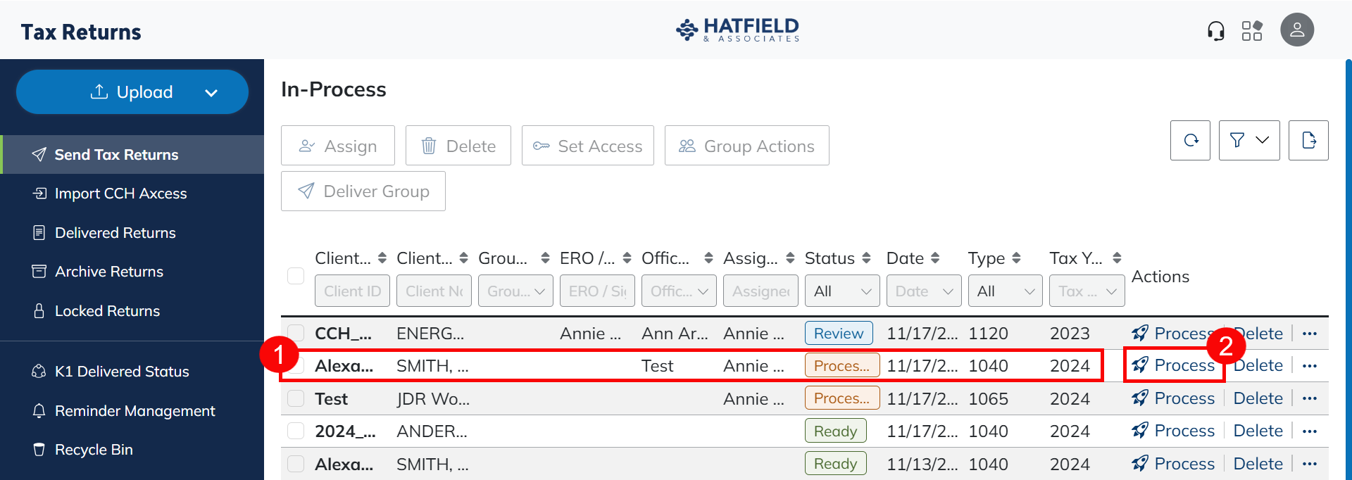 - Return will appear in Tax Returns In- Process section with a Processing status.