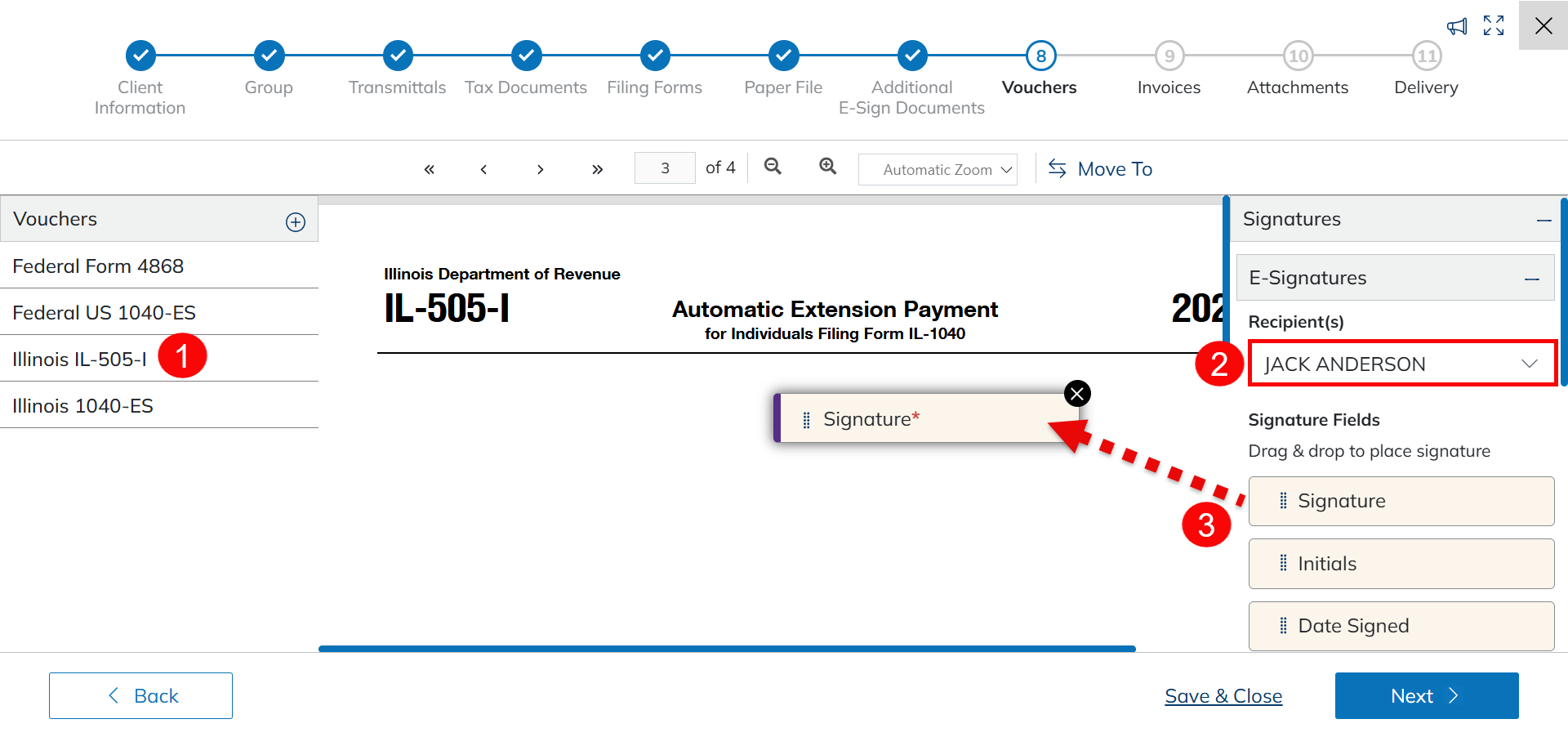 The Vouchers section displays all pages in the return that were recognized as payment or estimated vouchers. These initial payment vouchers can be edited or deleted, and new payment vouchers can be manually added. For Extensions, signature blocks can be placed on voucher forms.