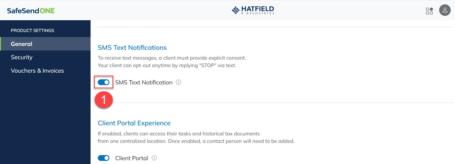 - Toggle SMS Text Notifications to On to provide the option for clients to receive signer reminders via text message.