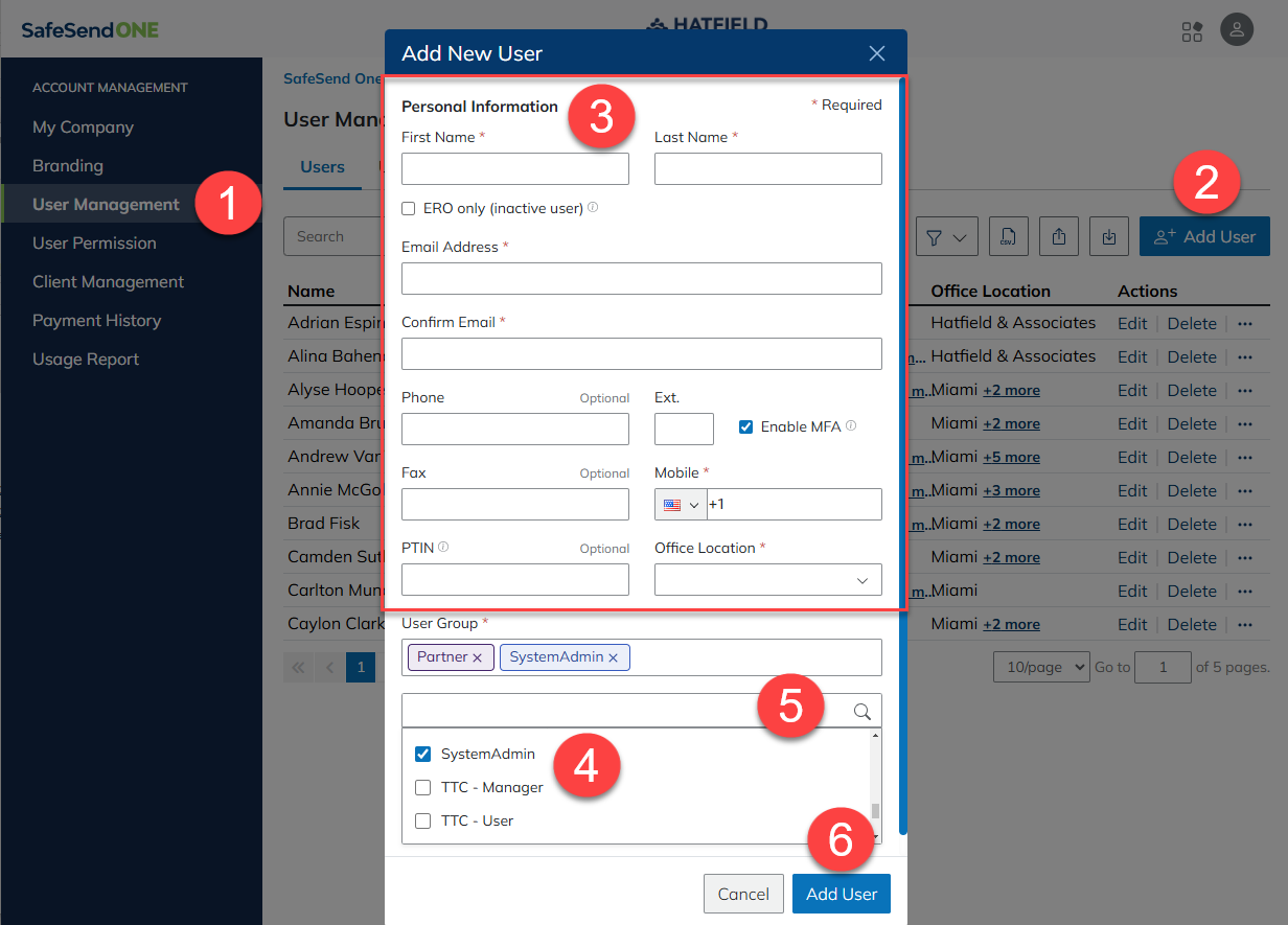User Management is where you can add users, delete users, and configure settings for users who will access products in SafeSend. The Groups control the activities that a user can perform.