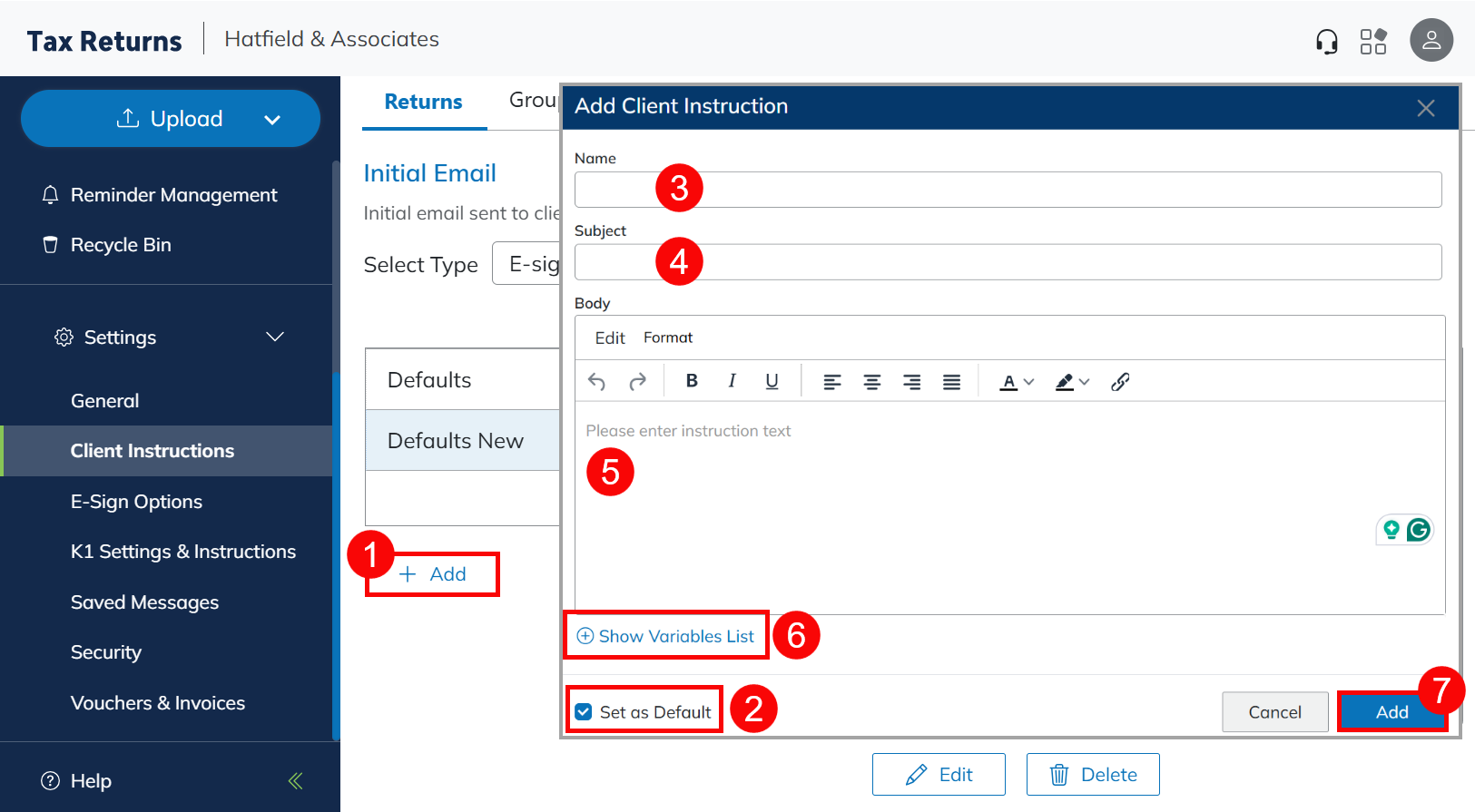 - Tip: Use the <RECIPIENT> variable in the Subject line to automatically include the taxpayer, spouse, or entity name. This can help clients with multiple returns easily identify them.