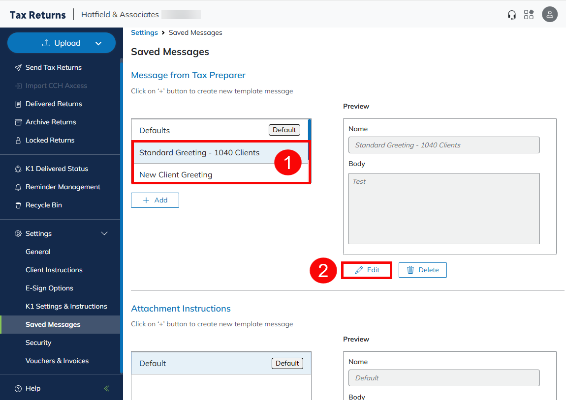 - Click the Add button next to Saved Messages, Attachment Instructions, or Paper Filed Instructions.