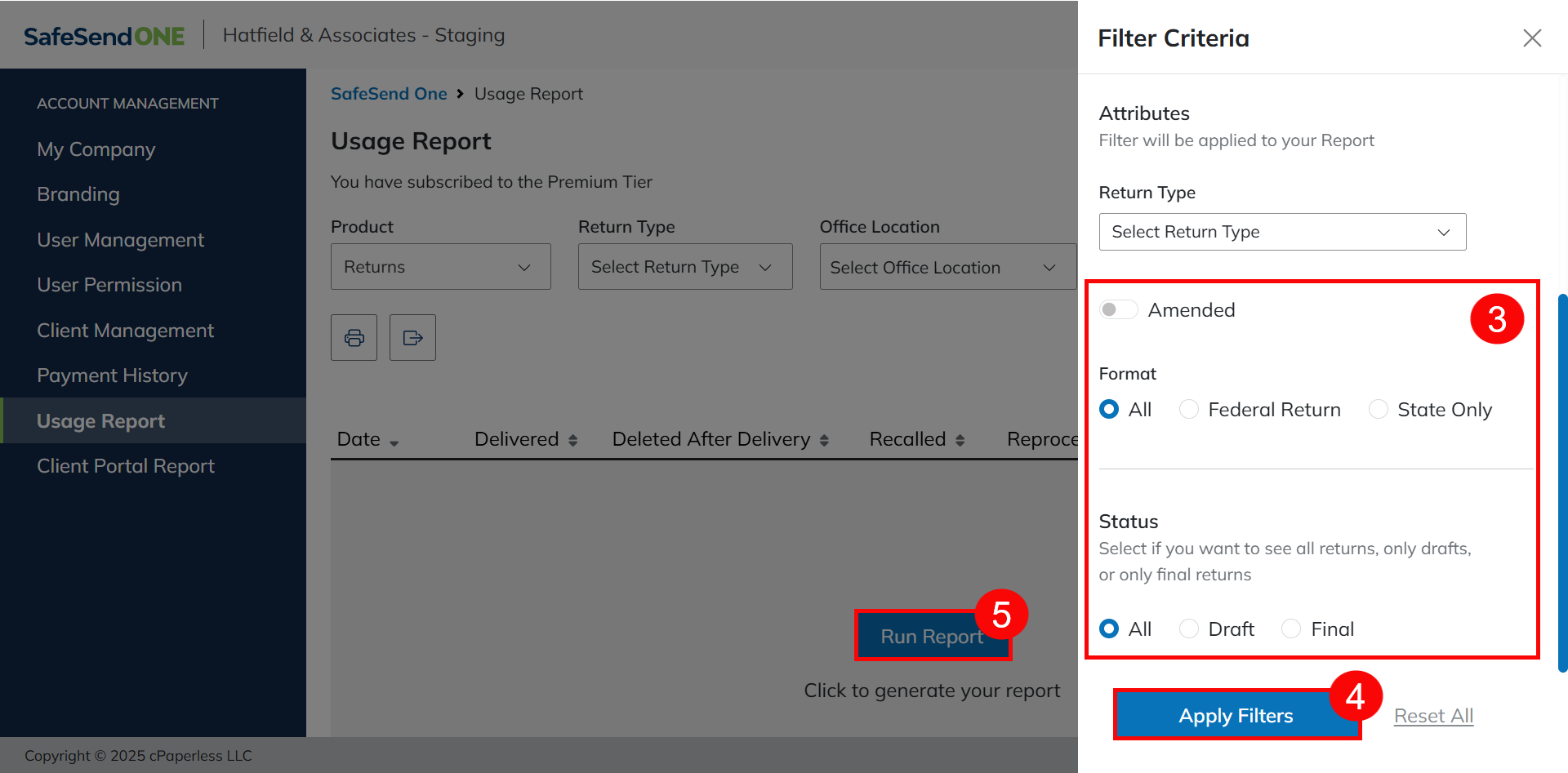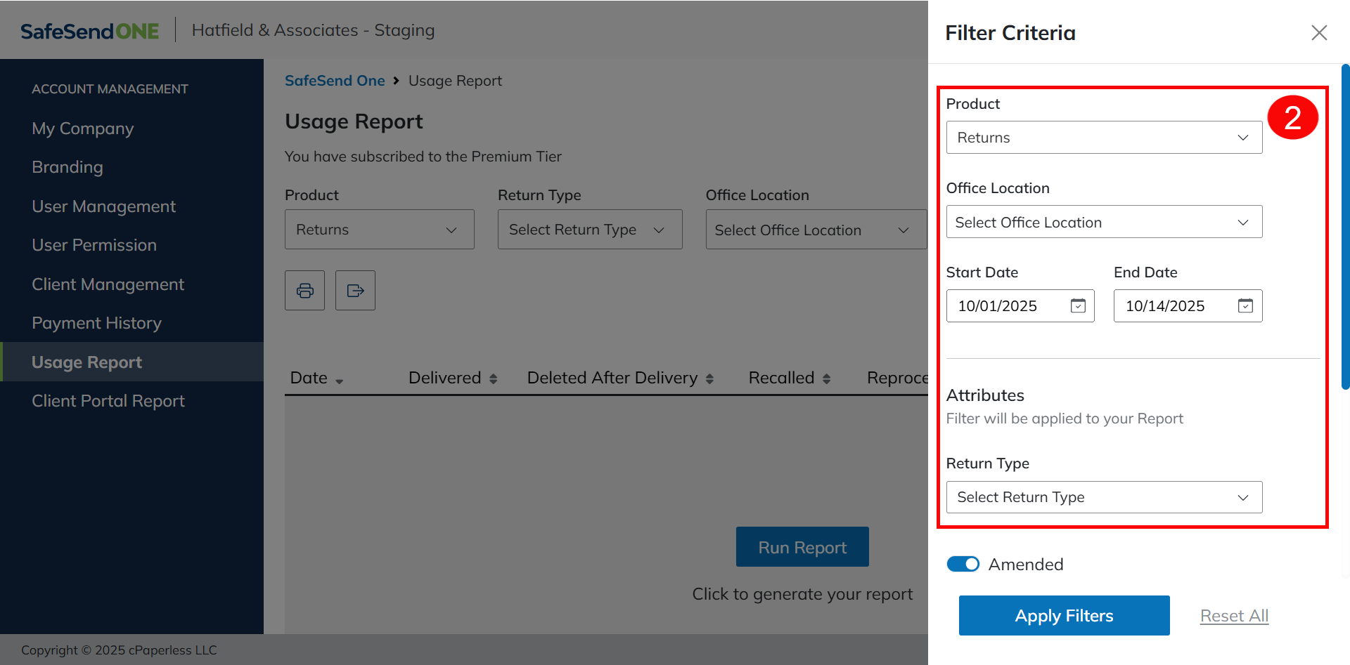 Use the Advanced Filter option to customize your report. This allows you to add amended returns to your report, as well as filter by state only and draft status.