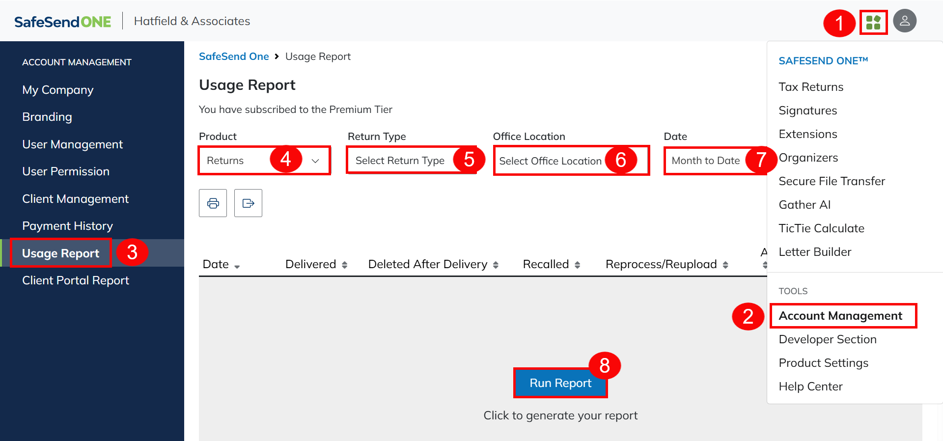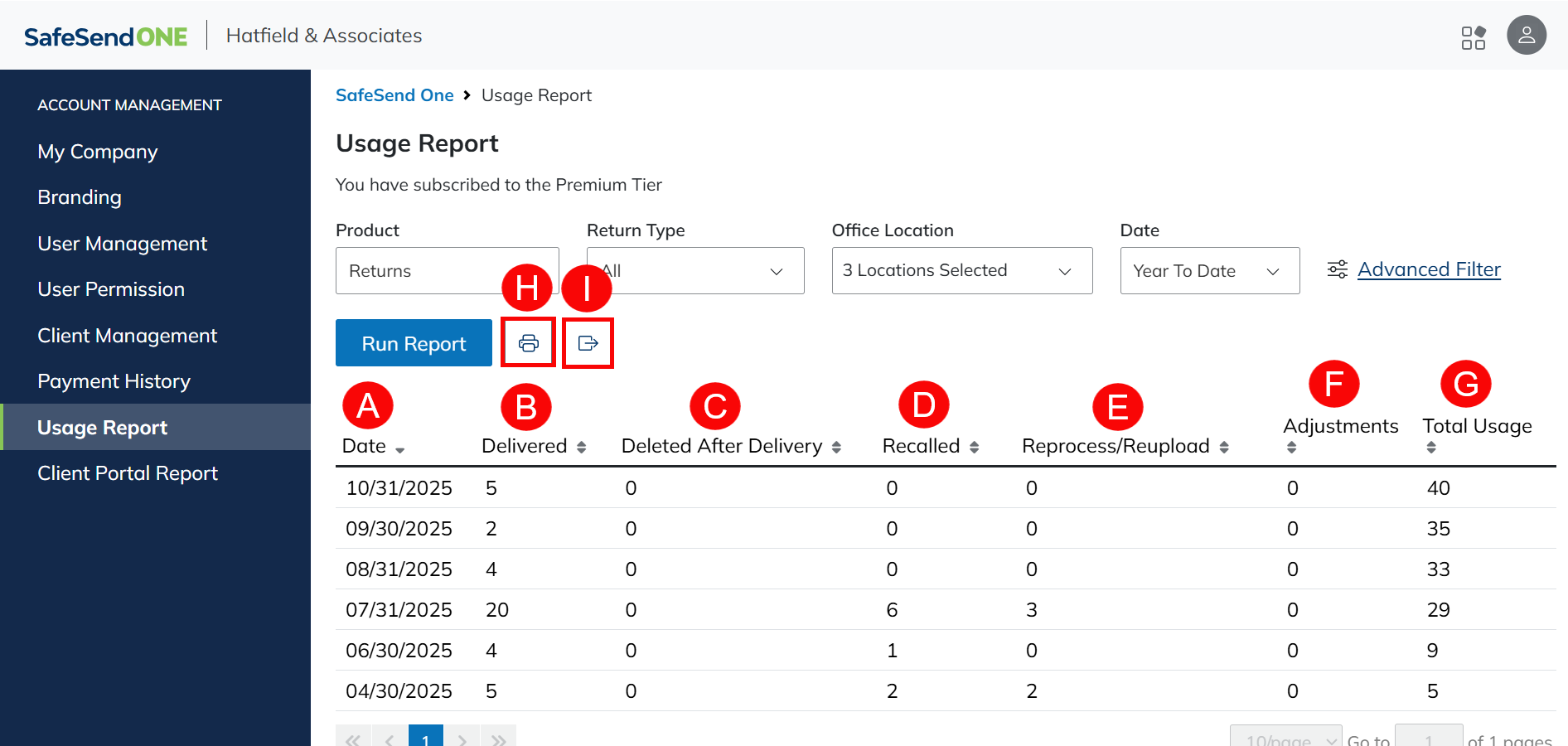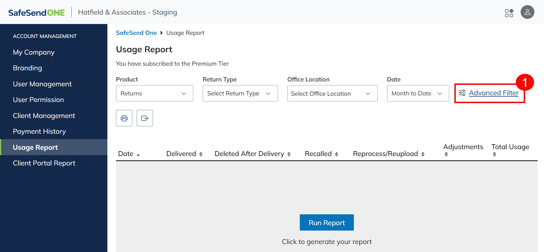 The Usage Report allows you to view the firm's activity in SafeSend. Administrators can view how many items were delivered, adjustments, and total usage for Returns, Signatures, Mail Merge, Organizers, Gather, and Extensions.