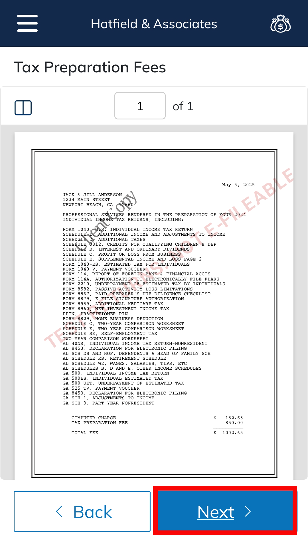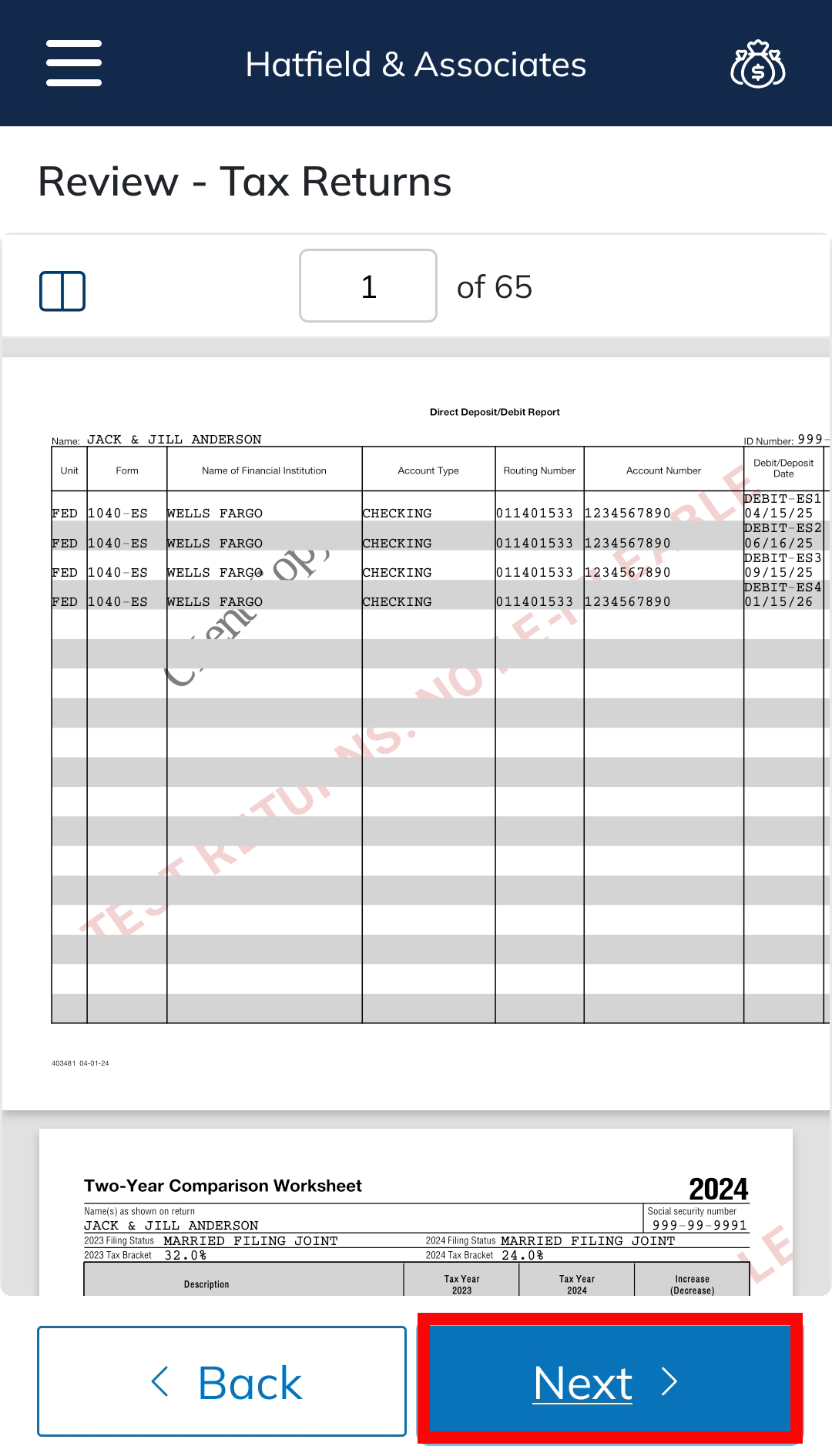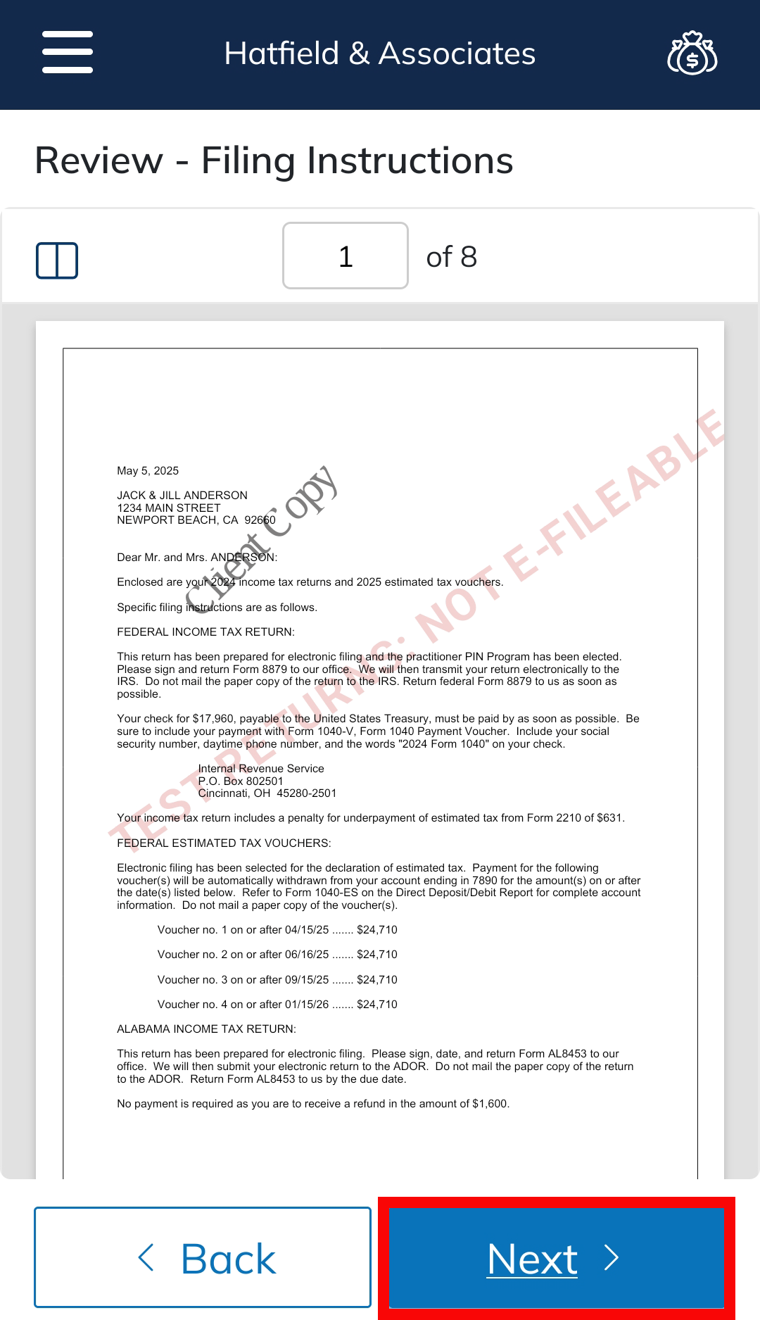 The taxpayer can review their tax documents, beginning with their invoice (if included), then their filing instructions, and finally the tax return.
