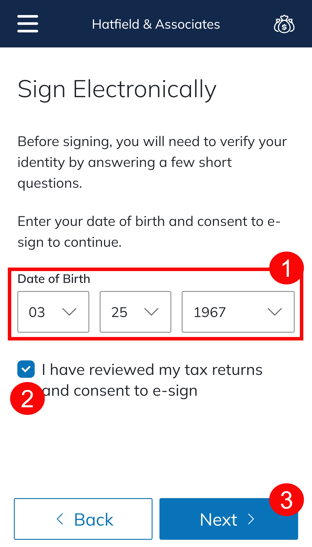 The taxpayer is prompted to enter their date of birth and consent to e-Sign (1040 returns only).