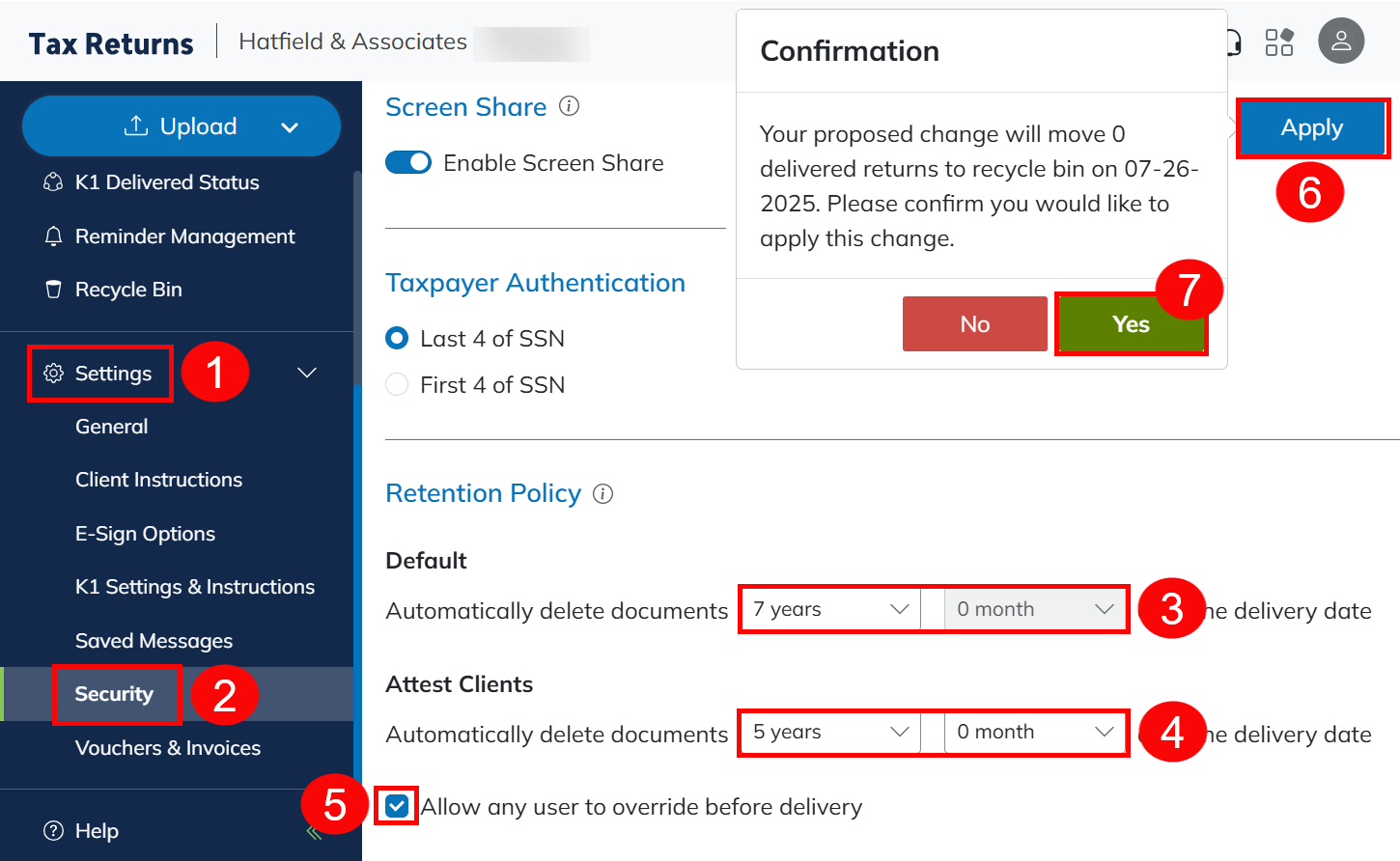 - When the Retention Policy is changed, a pop-up appears warning of the number of returns about to be moved to the Recycle Bin.