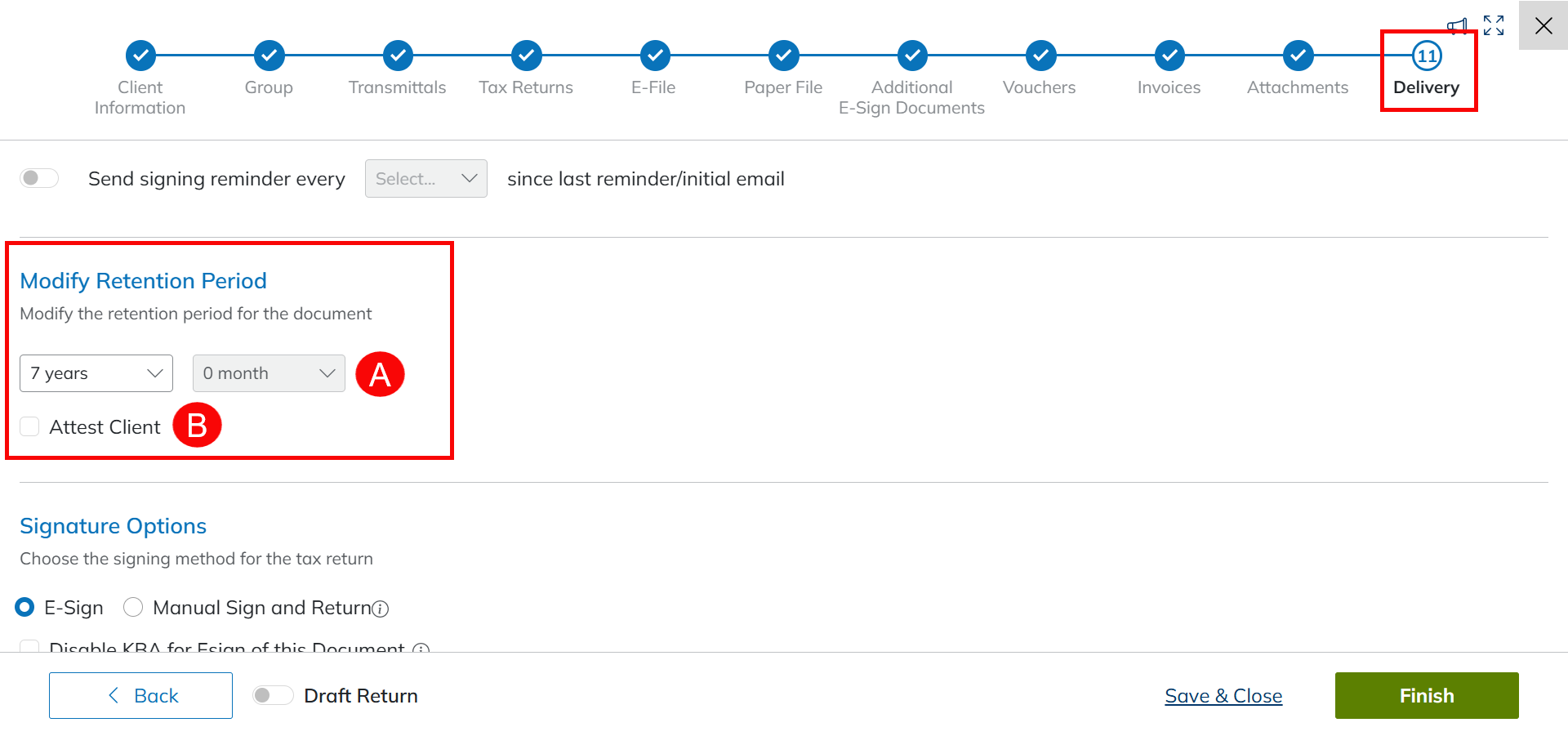 - The Default Retention Period is 7 years from the date delivered and 5 years for Attest Clients.