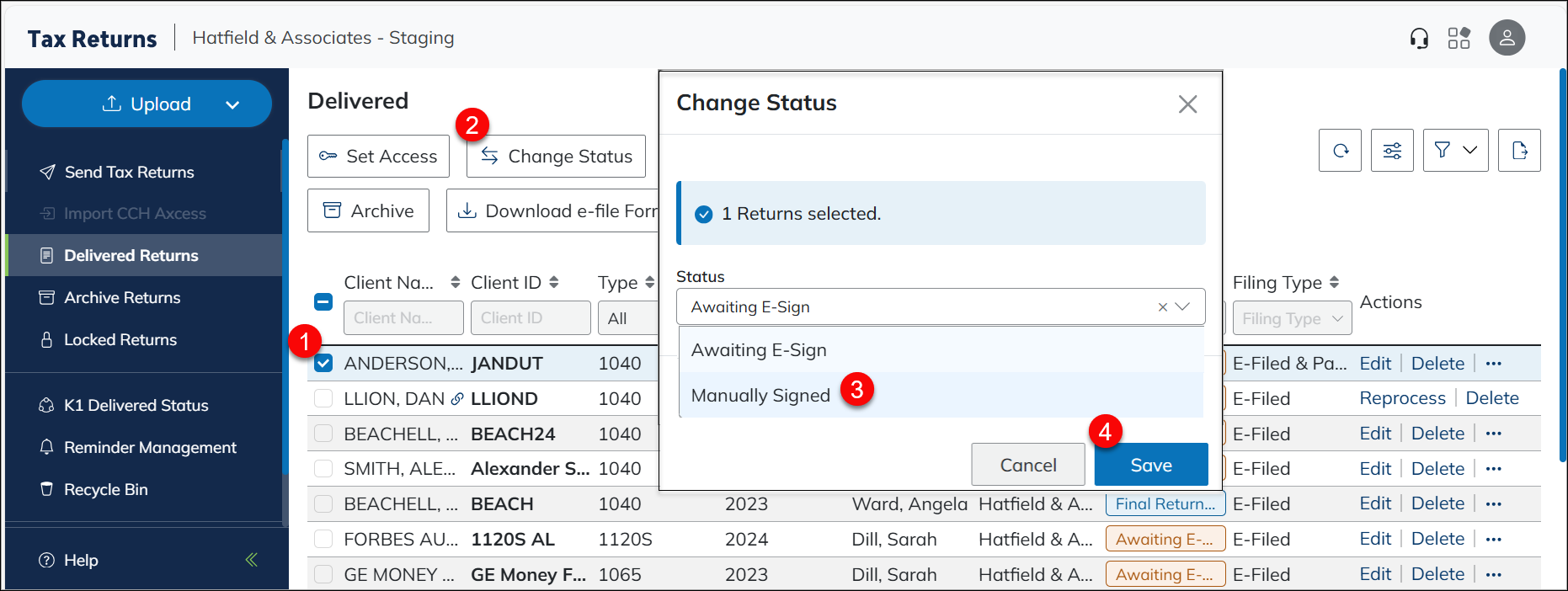 You can change the status of a return from Awaiting E-Sign or Awaiting Upload to Manually Signed. The status cannot be changed if the return has been e-signed or uploaded.