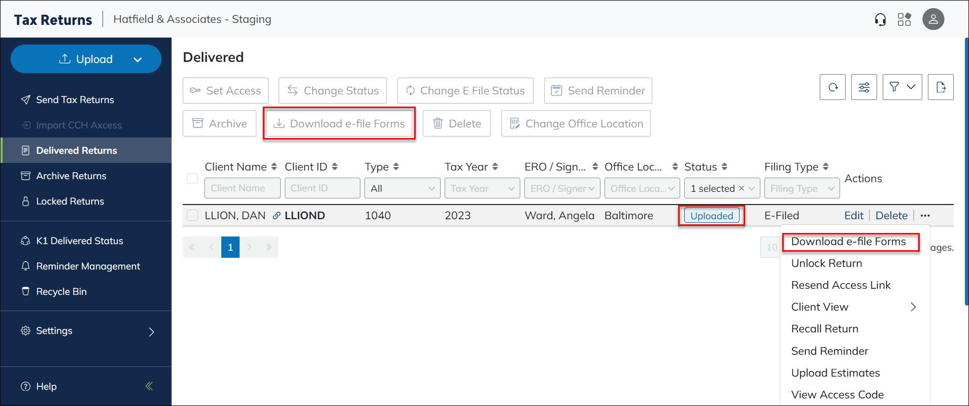 Click Download e-file Forms using the Bulk Action Icon or the Action Menu.