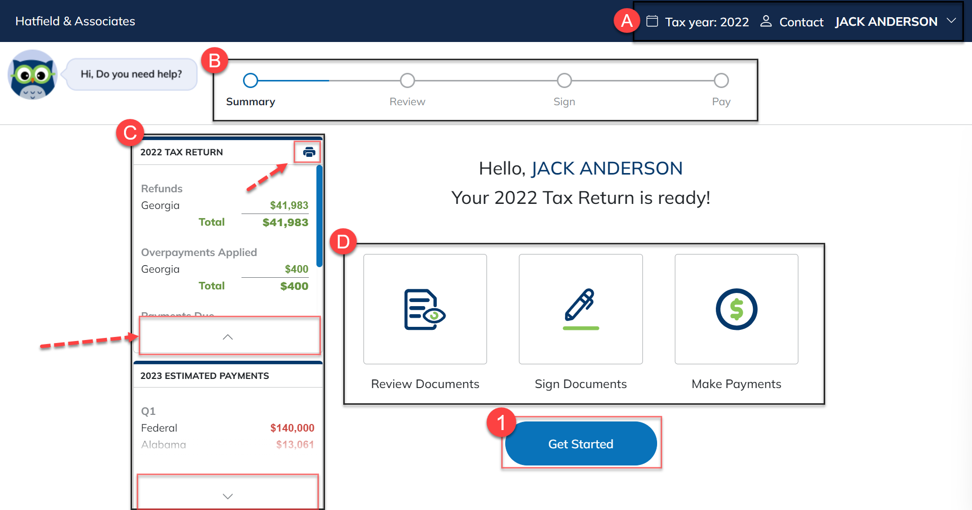 This article outlines the full taxpayer experience. The taxpayer can access the return, review, sign, pay vouchers/invoices, deliver K-1s, and download documents.