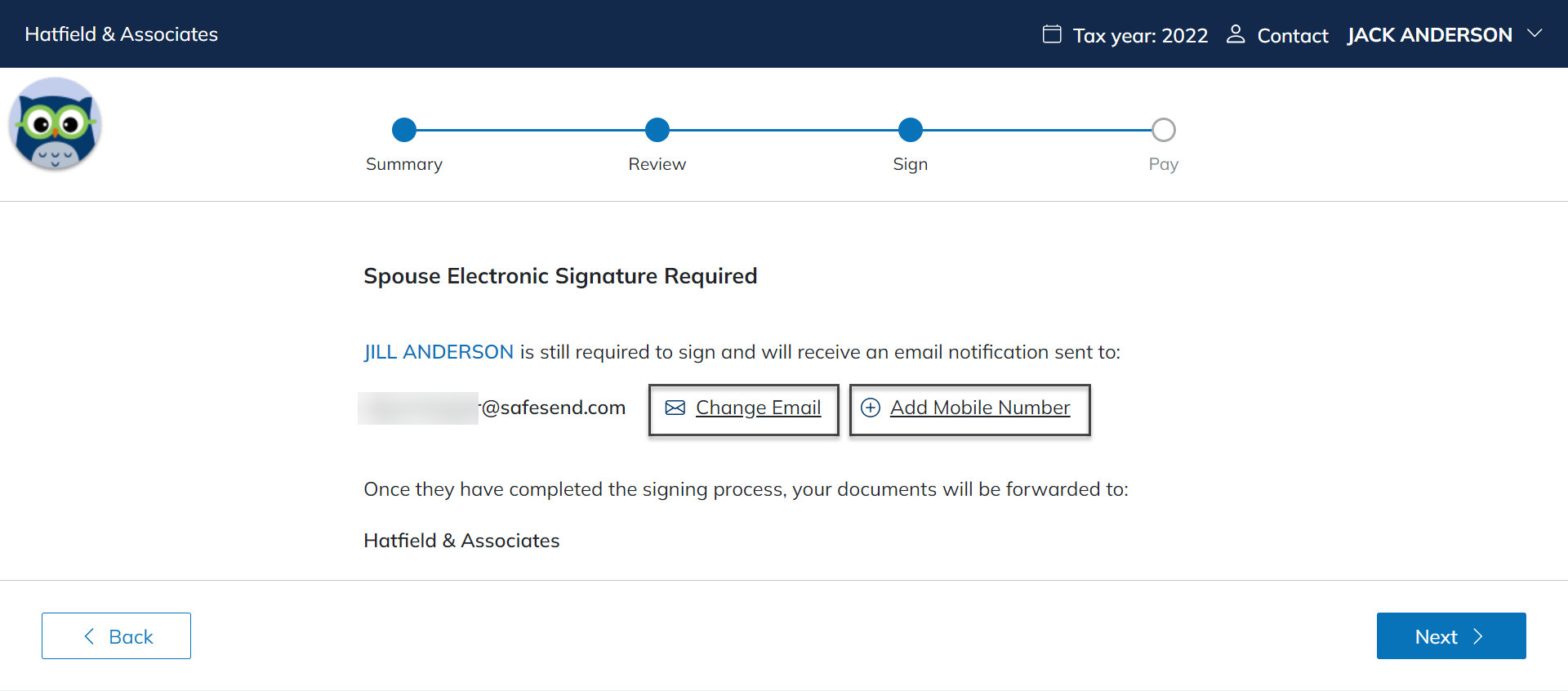 If there is a spouse on the return the confirmation screen below appears. Here you can update the spouse's email and add a phone number (optional). Click Next to finalize signing.