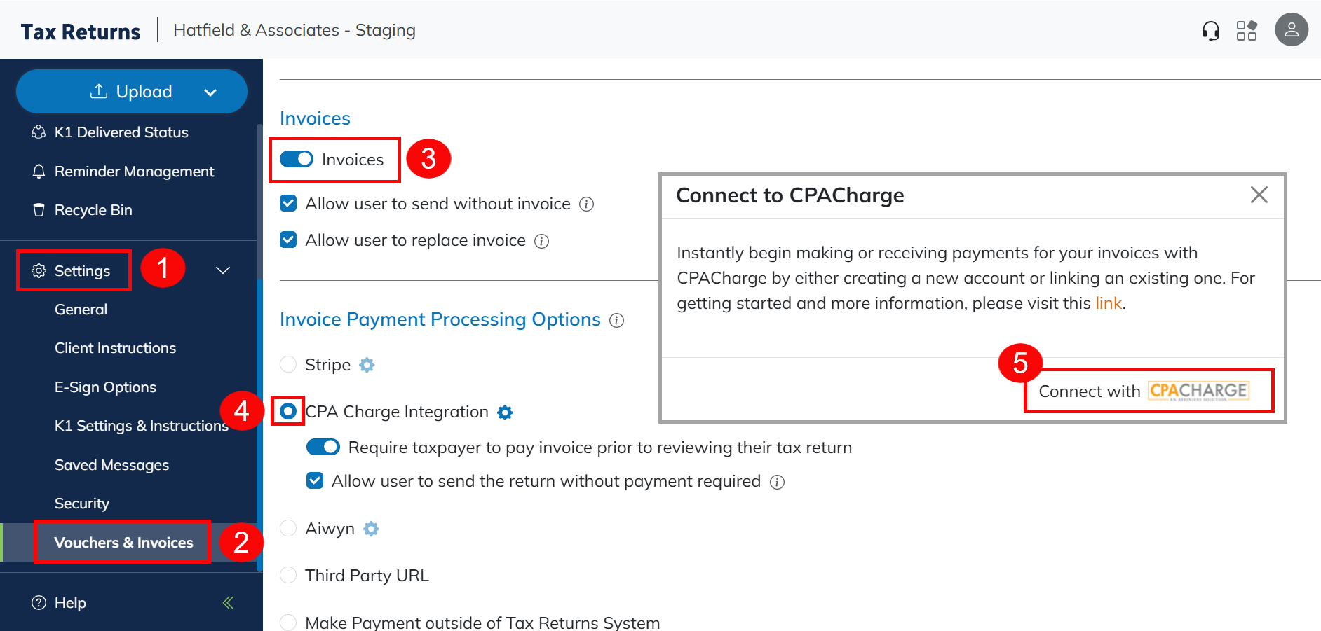 - Click CPACharge Integration under Invoice Payment Processing Options.