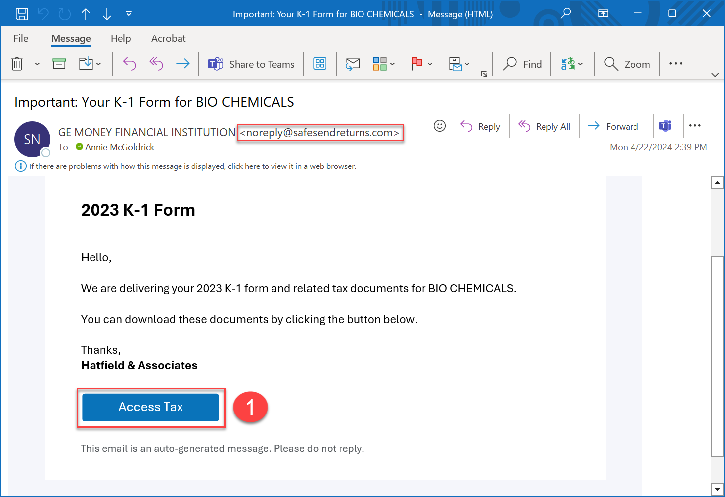 The partner or shareholder receives a link via email to access the K-1 package. The email comes from noreply@safesendreturns.com.