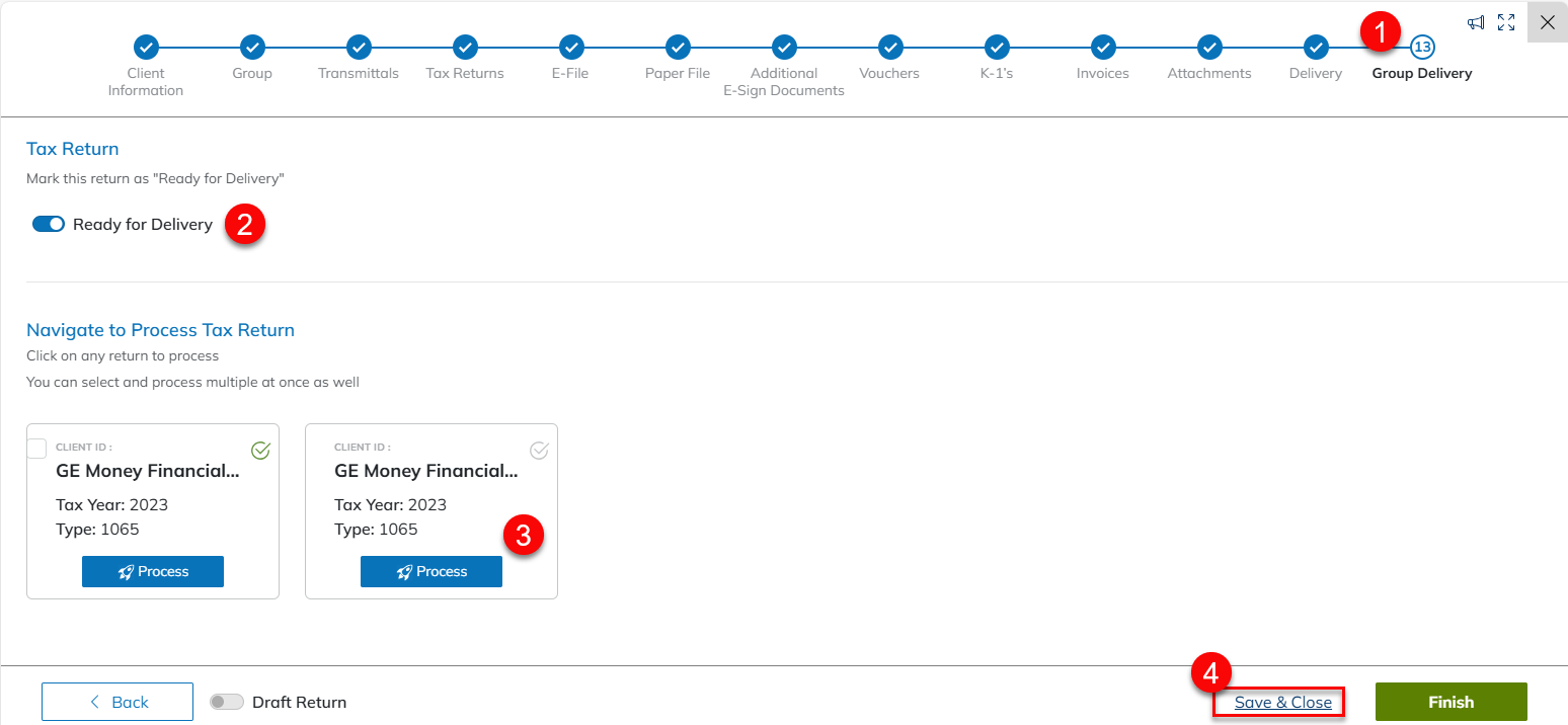 - Click Save & Close to return to the Tax Returns In Process dashboard.
