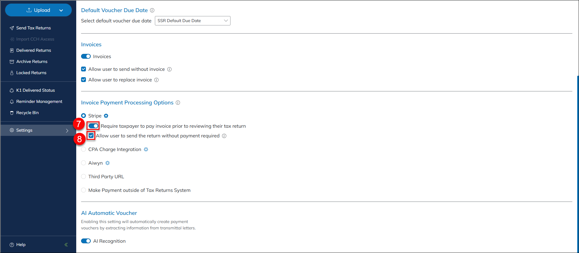 - Toggle the Require taxpayer. . . button on to have the default setting during processing require taxpayers to pay their invoice before they review and sign their return.