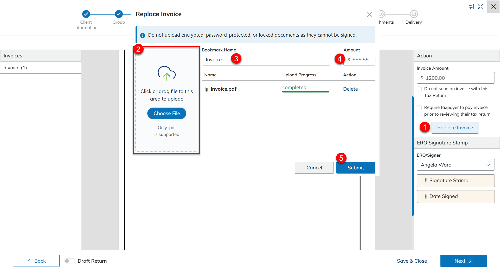 - Click Replace Invoice to add an invoice or to replace the existing one.