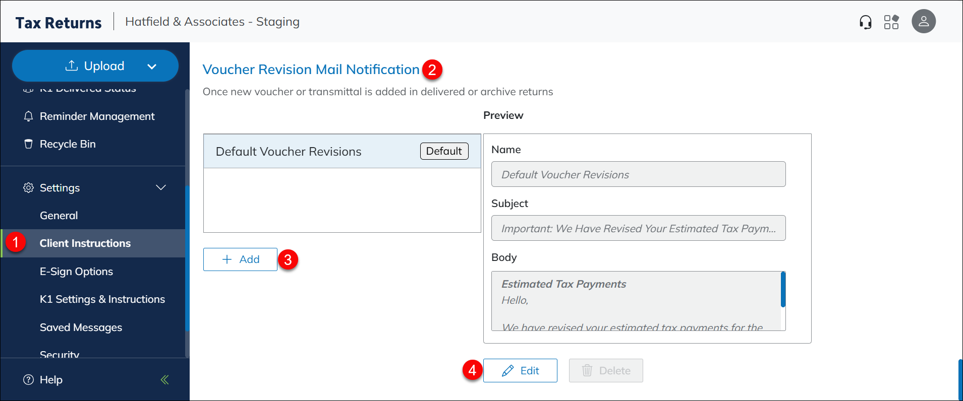 After the new/updated estimated vouchers are delivered to the taxpayer, an email notification will be sent to them. The email notification will be taken from the pre-defined Client Instructions: Voucher Revisions section.