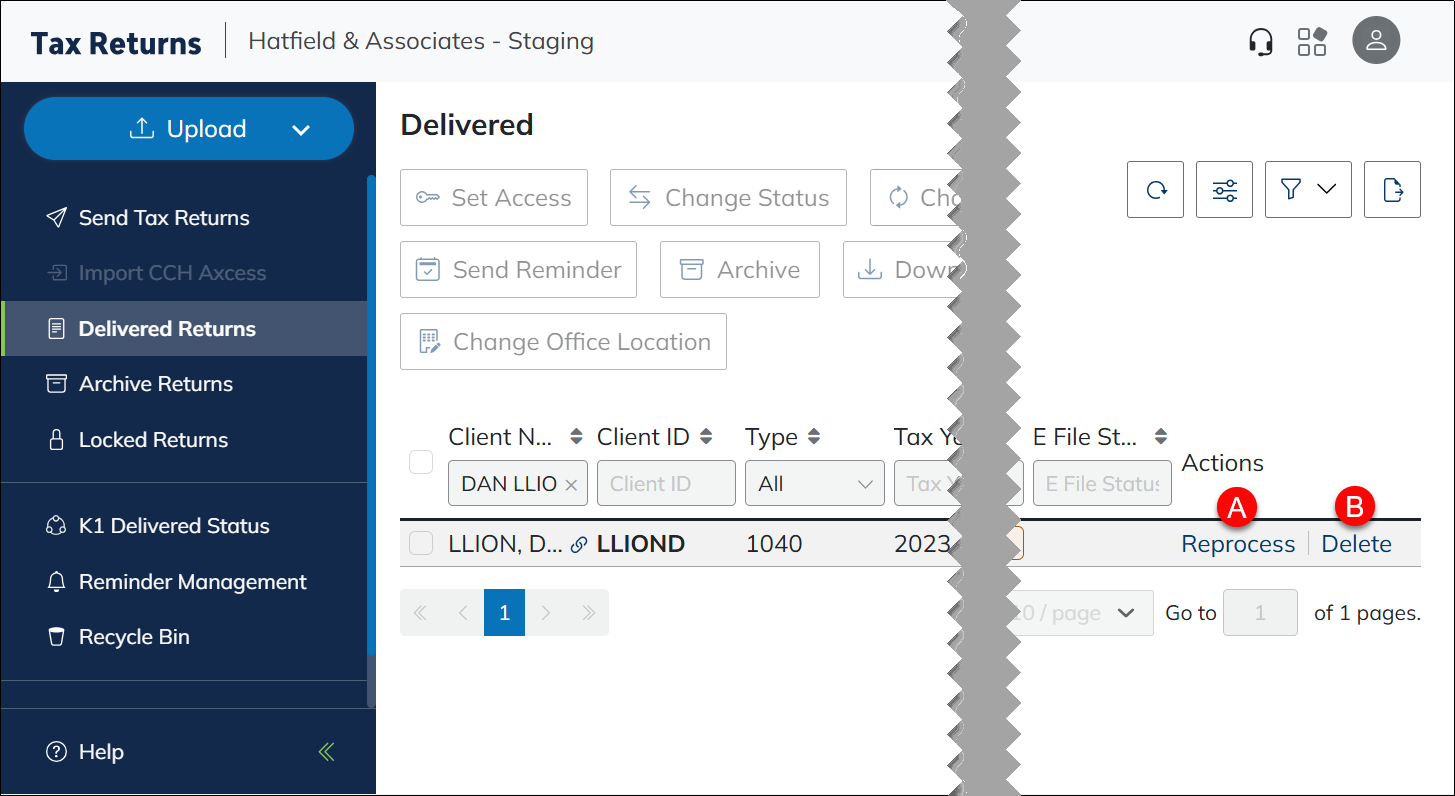 - Client Id, Tax Year, Taxpayer/Spouse Name, and Taxpayer/Spouse Email are automatically pulled from the previously delivered return. This can not be edited in this window.