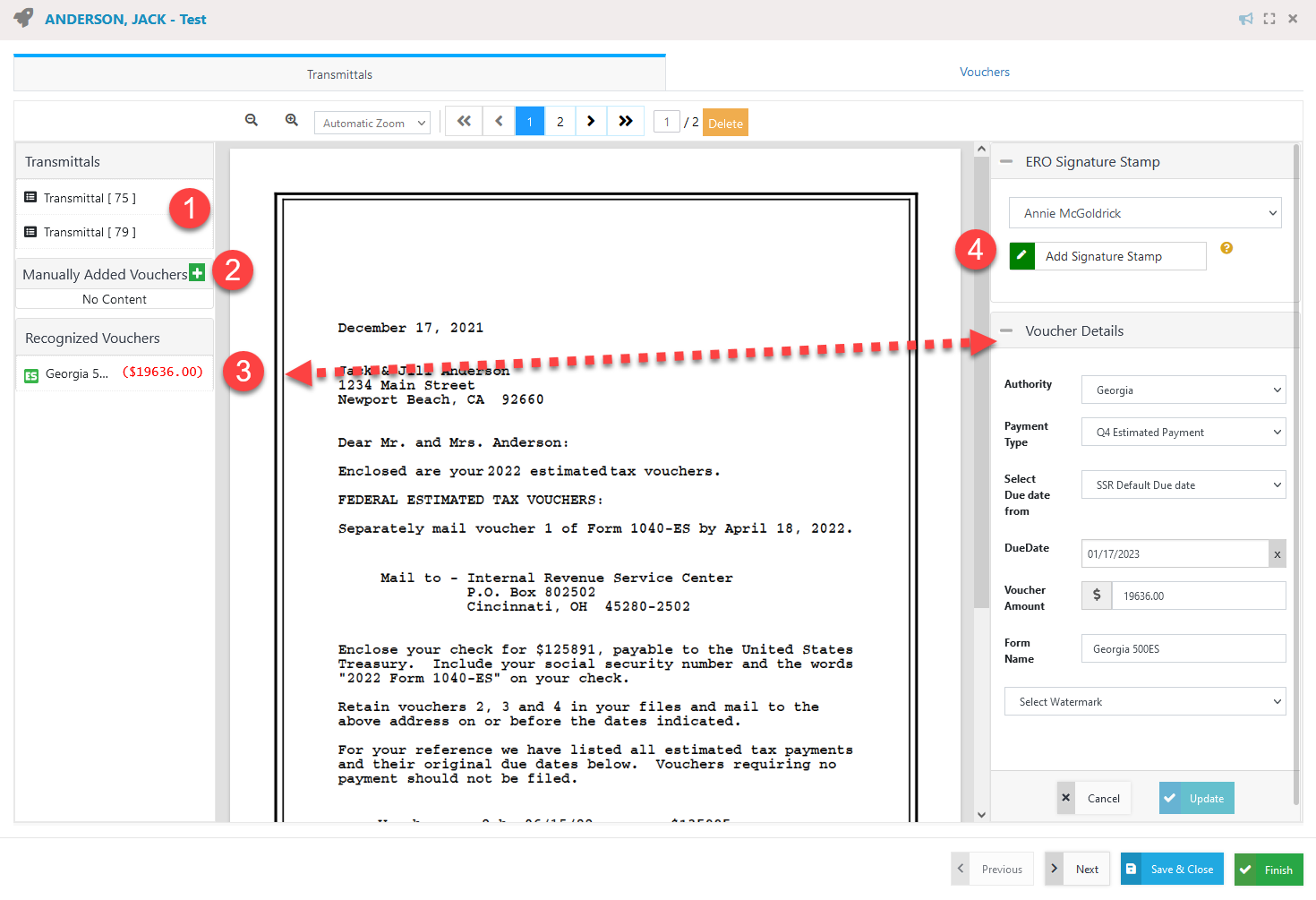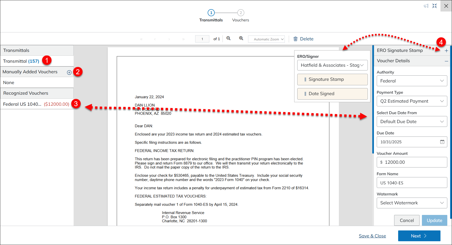 If estimated tax vouchers have been changed after initial delivery, users can upload updated and/or new estimated vouchers and deliver those to the taxpayer.