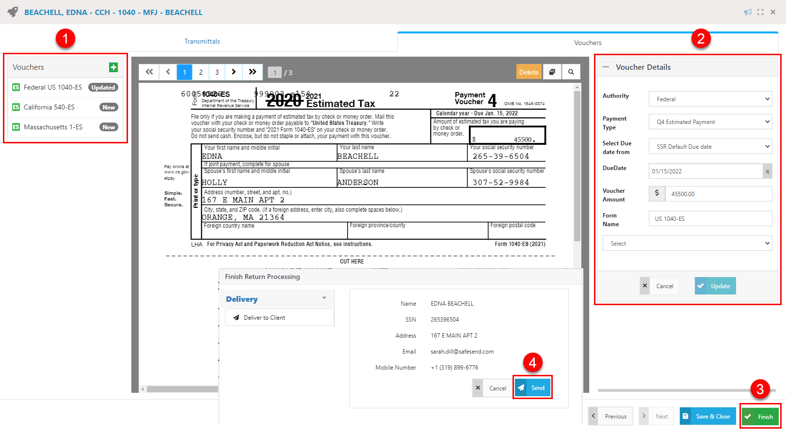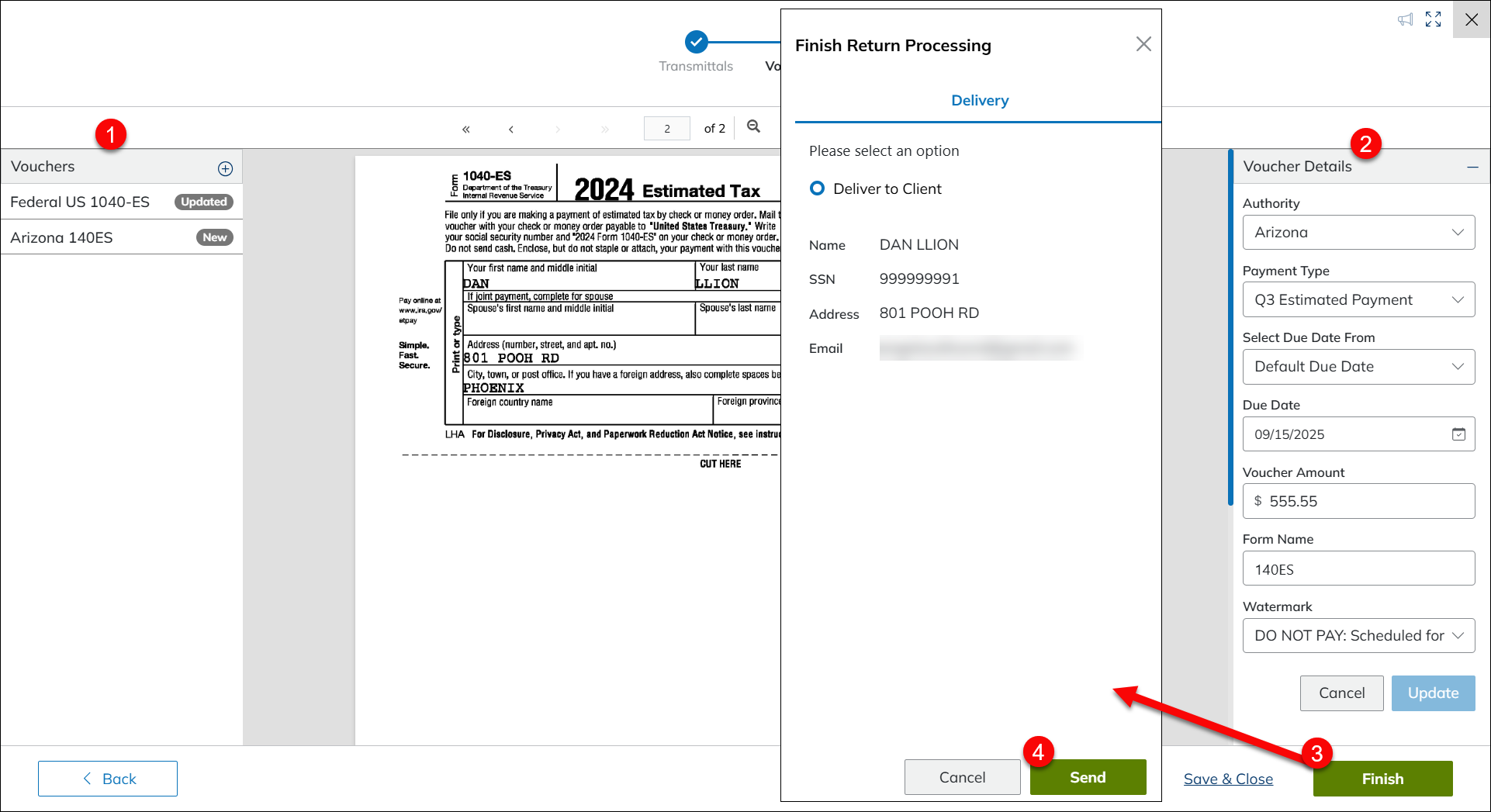 - Click Send in the Finish Return Processing window to deliver the updated estimated vouchers to the client.
