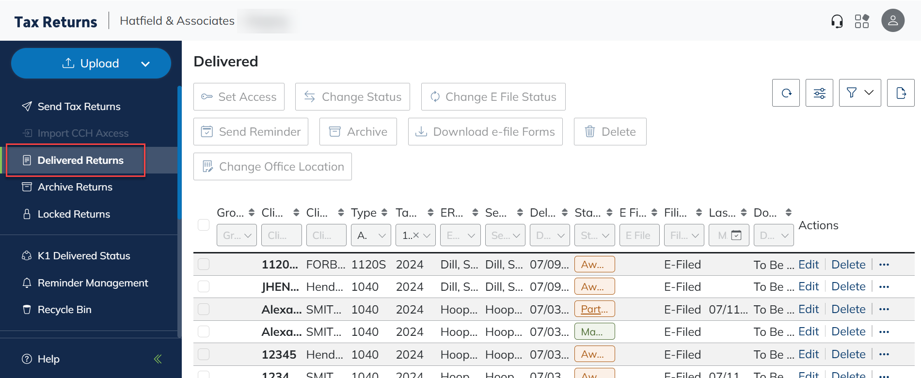 The tax year filter is automatically applied to show the most recent tax year returns.